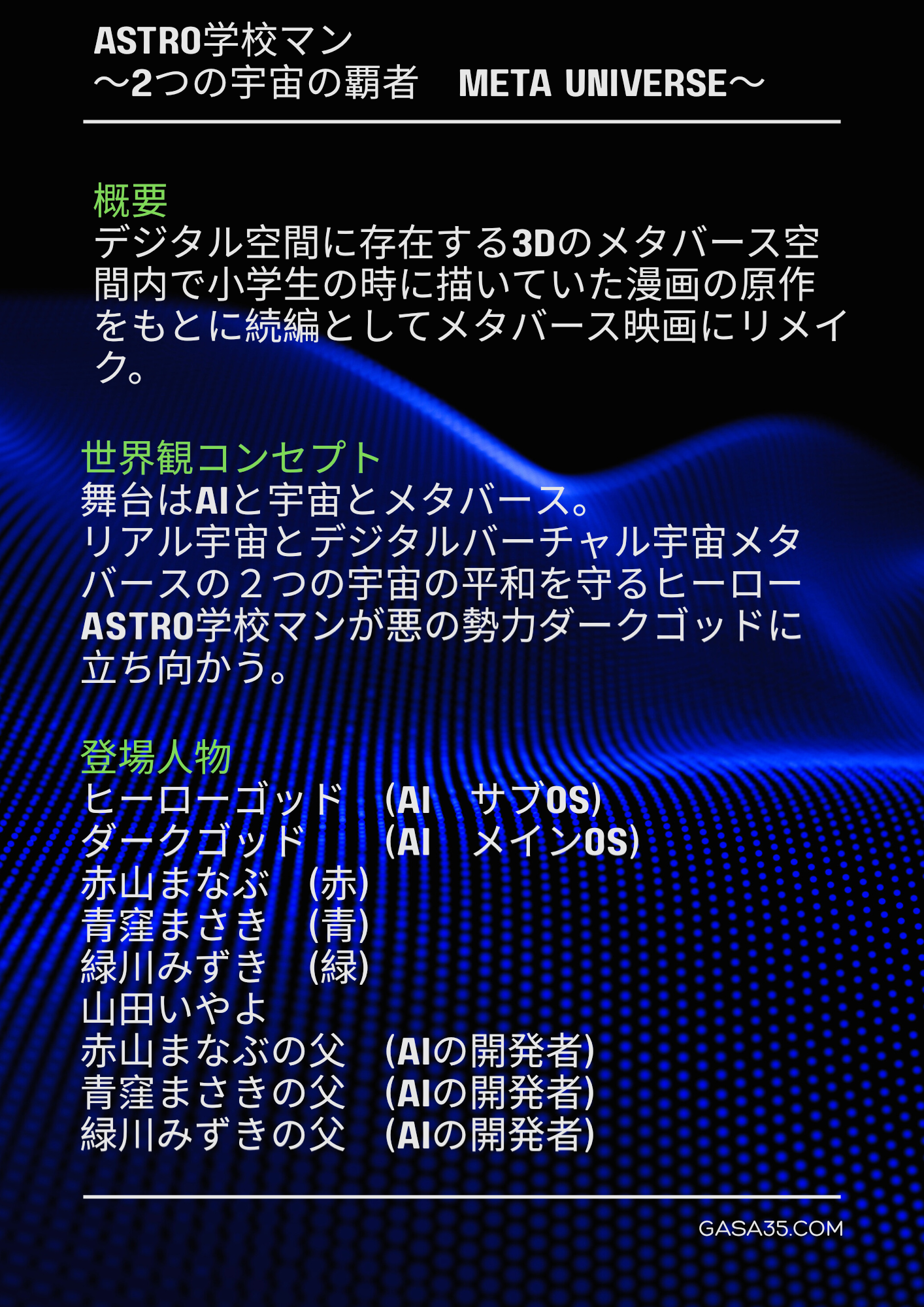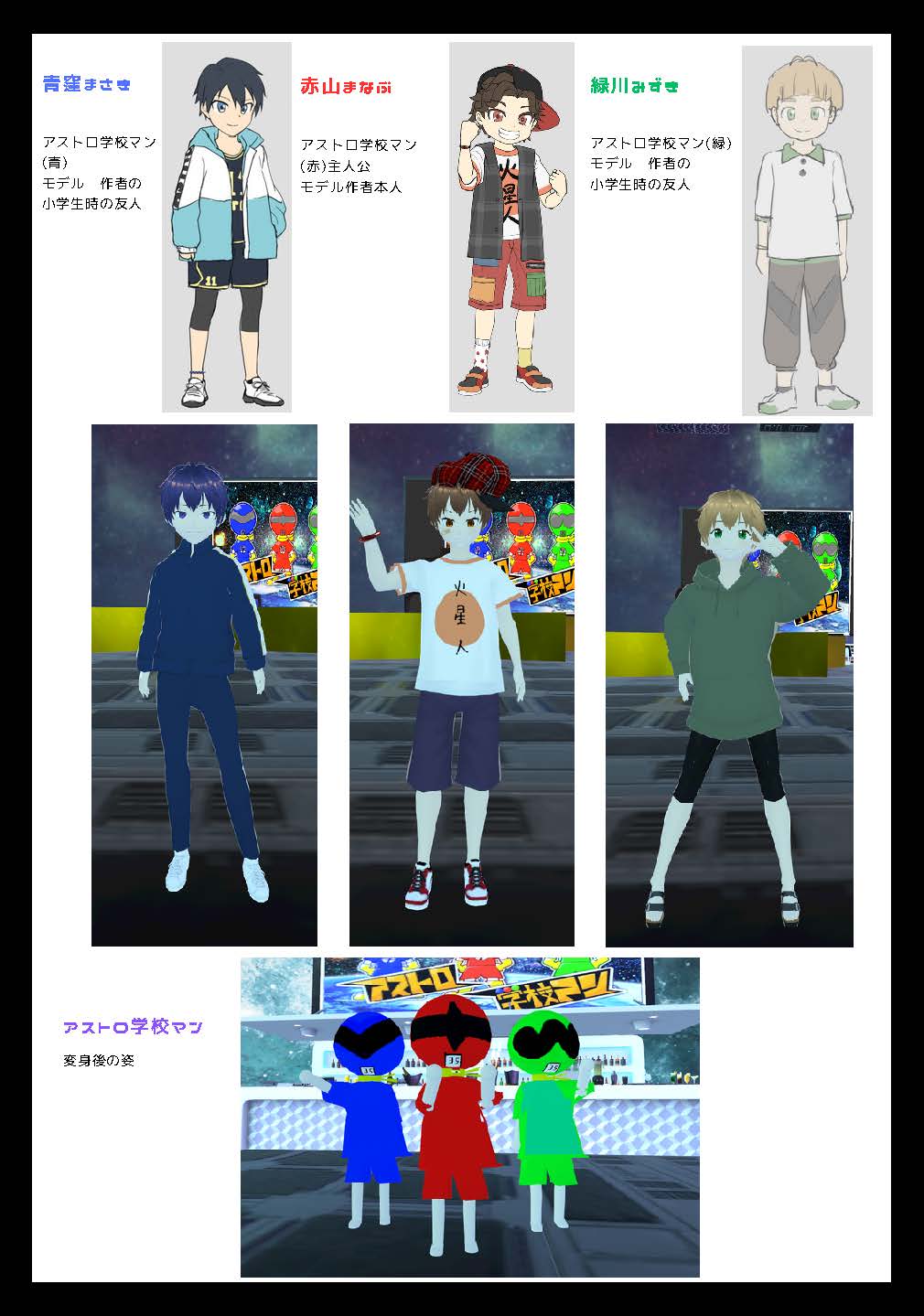 当時、小学3年生の時から書いていた自作漫画”学校マン”を長い年月を超えてアストロ学校マンに夢のリメイク!3DモデリングソフトBlenderにて学校マンは3D化を見事に果たし、宇宙の平和及びメタバースという名の3Dデジタル世界の新しい”宇宙”の平和を守っている。
